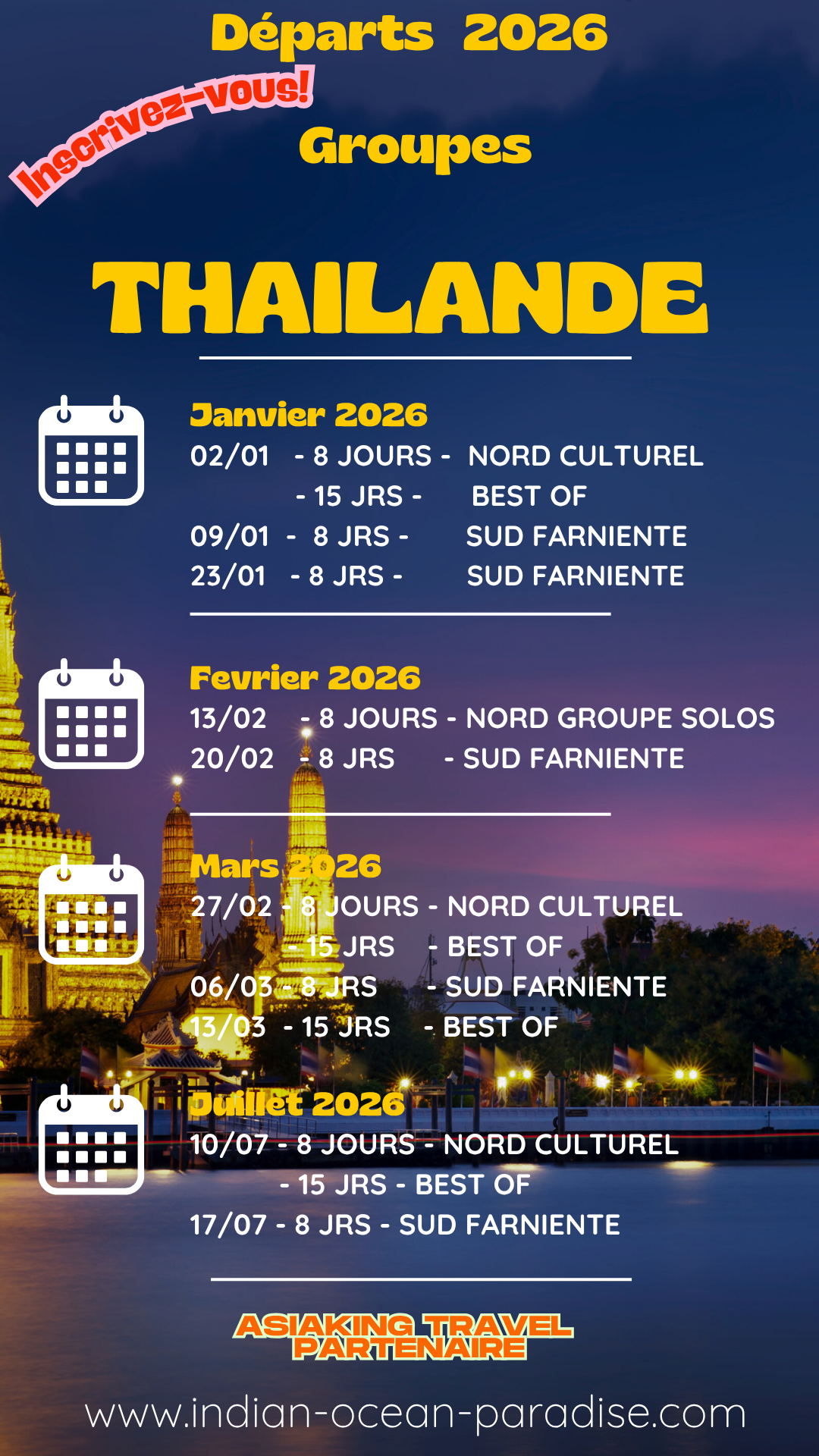 Idéal pour les thématiques " Visites culturelles" mais aussi pour les thématiques "Farniente". La Thaïlande offre un concentré de beaux paysages et monuments historiques. Cette destination est incontournable pour ceux qui ne l'ont jamais fait ou pour y vivre différentes expériences. N'hésitez pas à la découvrir dans nos itinéraires conçus avec et réalisés par notre partenaire AsiaKing Travel.